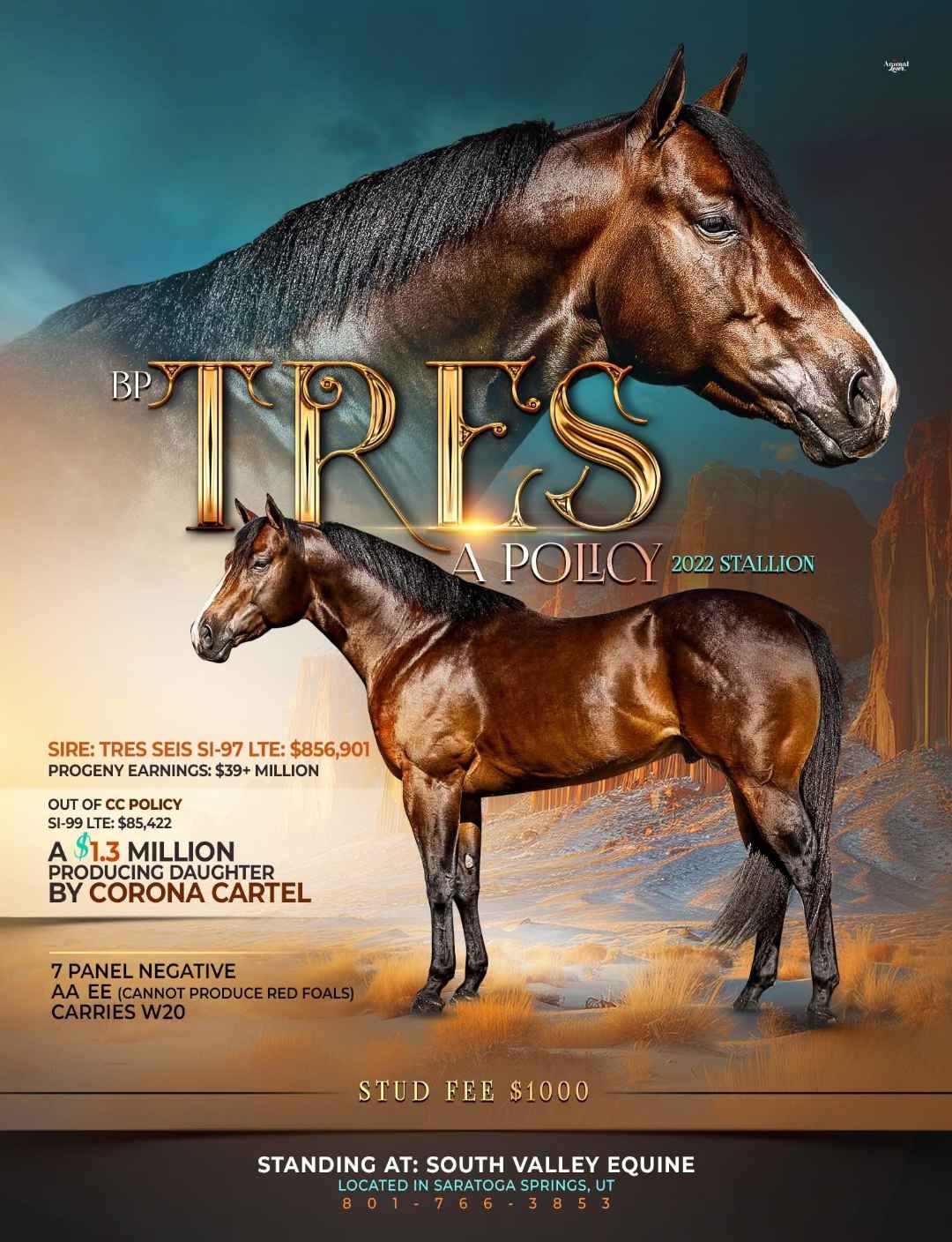 Enhancing this already powerful maternal foundation, BP Tres A Policy is sired by the remarkable Tres Seis (SI-97), with lifetime earnings of $856,901, Race Progeny Earnings of $29,730,558, and Barrel Progeny Earnings exceeding $8,642,250.