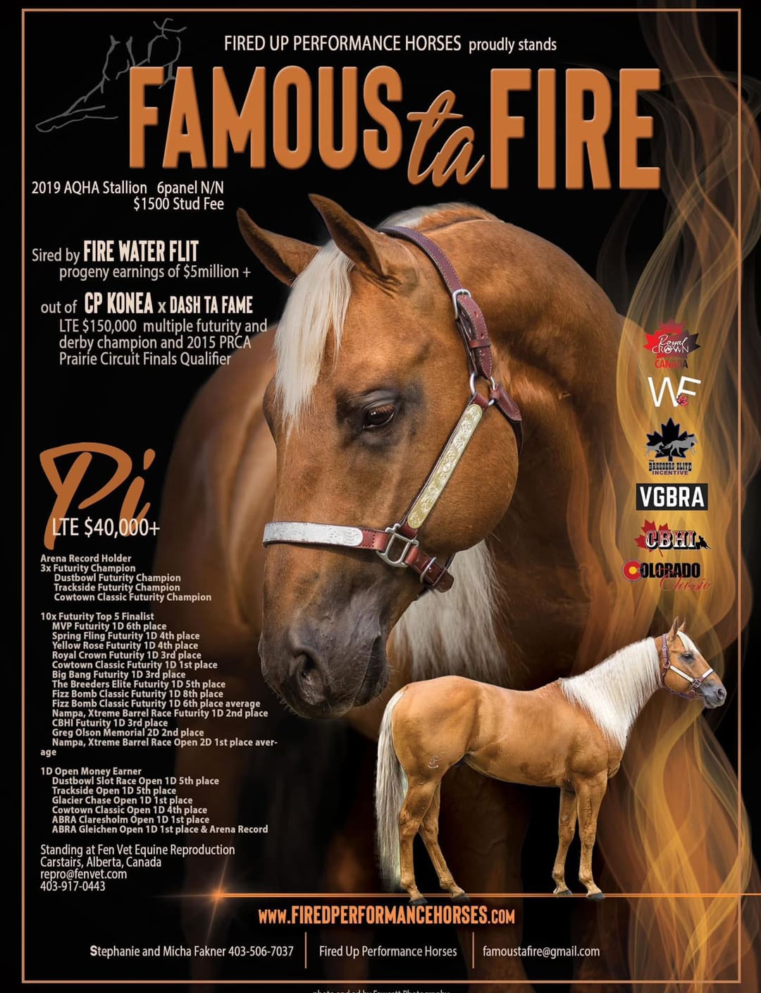 Famous Ta Fire is by FIRE WATER FLIT Out of CP KONEA LTE $150,000 daughter of DASH TA FAME out of a daughter of SIR CASHANOVA LTE $117,000+. Pyro has been passing his brains, solid build and exceptional mind onto his babies.